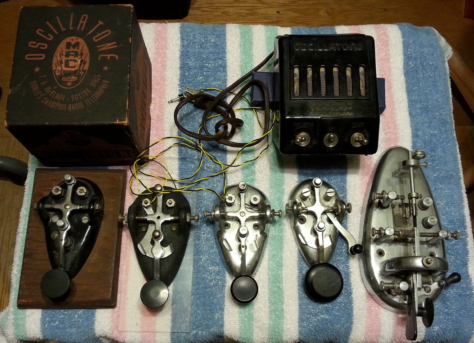 There's an uncommon Bakelite-based Streamkey at far left, followed by a Telegraph Apparatus Co. (not Inc.) copy* of the wrinkle-finished metal-base Streamkey (you can tell by the bulge in the lever arm at the contact area) and a pair of chrome-plated McElroys. The Streamkey is at far left, and it handles just as fast and sleek as it looks. At the very back, the accessory and its box: an Oscillatone code-practice oscillator. They are not especially rare and this one was offered at a very low price -- how could I pass it up?